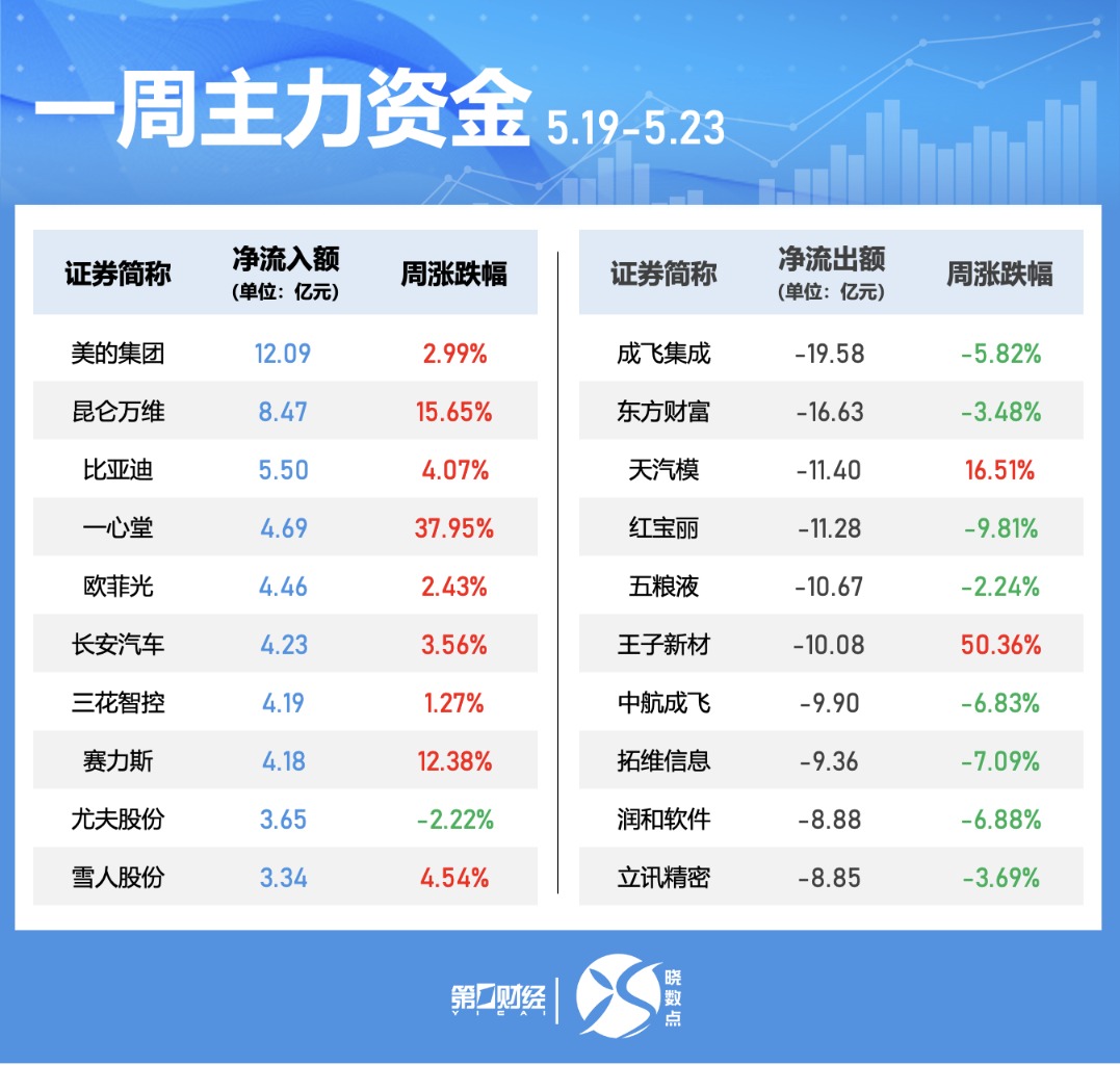 个股方面高亿管理,本周美的集团、昆仑万维、比亚迪获主力净流入居前,分别为12.09亿元、8.47亿元、5.5亿元;净流出方面,成飞集成、东方财富、天汽模分别遭主力净流出19.58亿元、16.63亿元、11.4亿元。