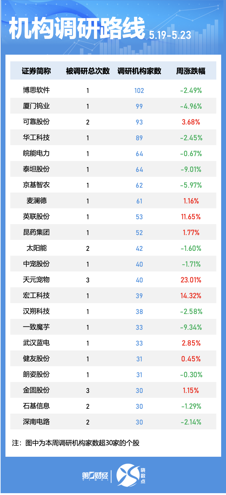 机构本周共调研了697家上市公司,其中博思软件最获关注,参与调研的机构达102家。此外,厦门钨业、可靠股份均获超90家机构调研。