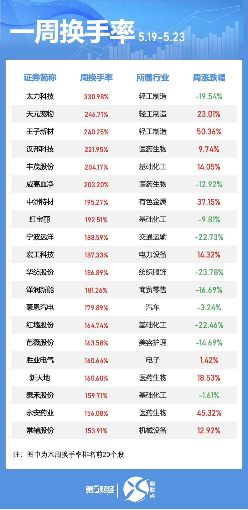 按照申万一级行业分类看,本周换手率100%以上的个股中,所属轻工制造、医药生物、基础化工等行业的个股居多。