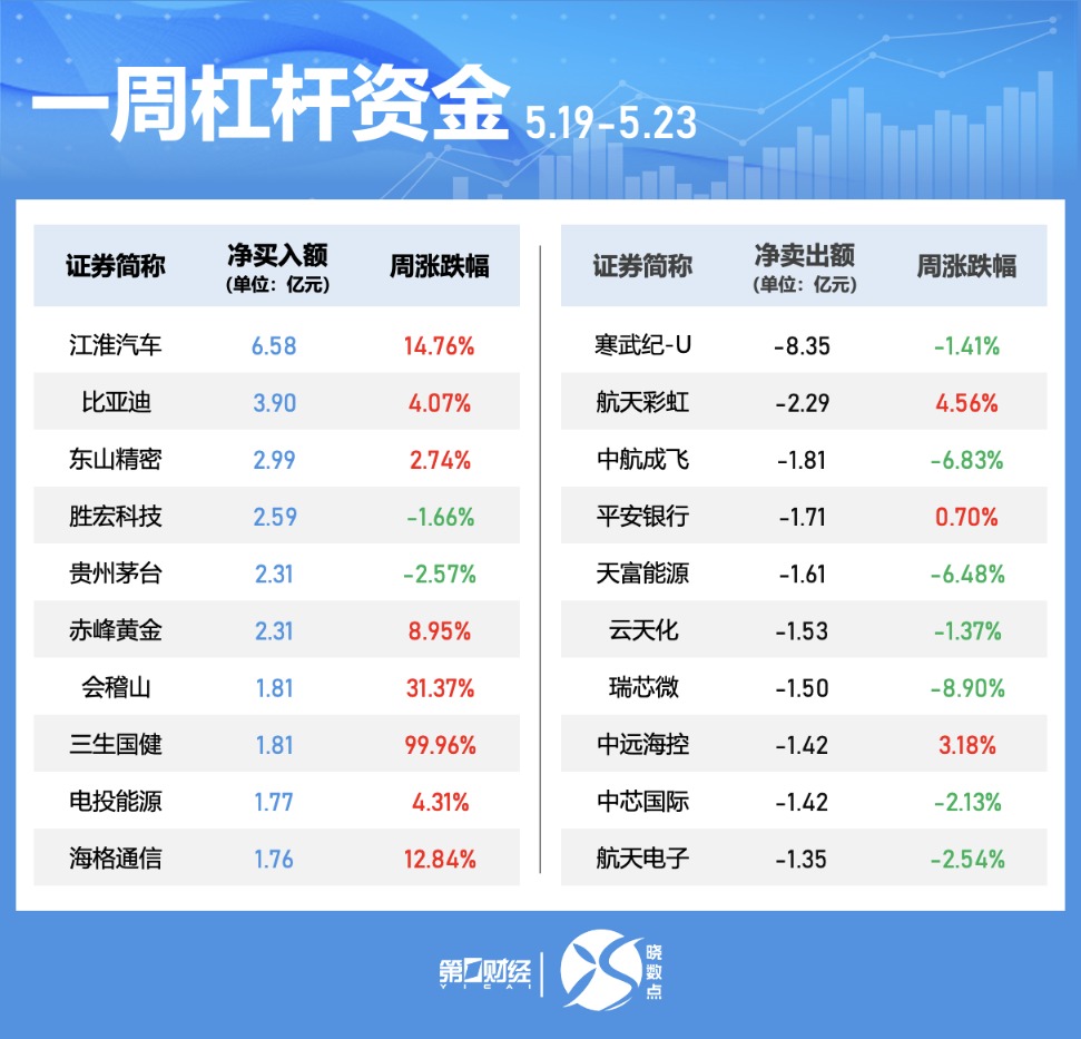 江淮汽车本周获融资净买入居首,净买入额为6.58 亿元。比亚迪、东山精密、胜宏科技净买入居前,金额分别为3.9亿元、2.99亿元、2.59亿元;寒武纪-U、航天彩虹、中航成飞遭净卖出额居前,金额分别为8.35亿元、2.29亿元、1.81亿元。