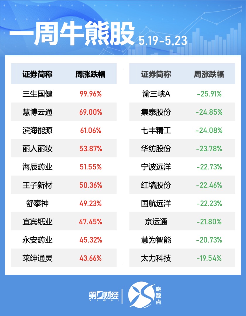 本周共有22只个股涨幅30%。创新药概念股三生国健本周累计涨幅达99.96%居首,周一到周四走出四连板。此外,本周慧博云通、滨海能源涨超60%,固态电池股滨海能源本周走出五连板,慧博云通走出四连板。
