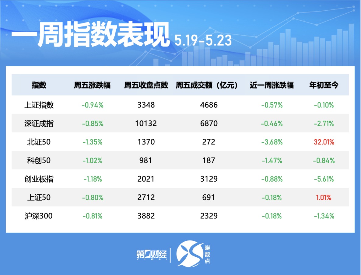 本周(5月19日至23日)的五个交易日中高亿管理,A股三大指数先扬后抑,全周累计下跌。其中上证指数累计跌0.57%,深成指跌0.46%,创业板指跌0.88%。板块概念方面,医药生物、轻工制造概念股表现活跃。